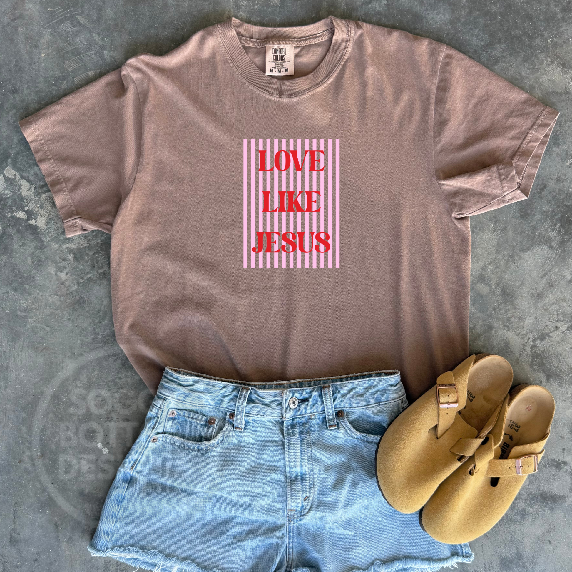 Our Love Like Jesus Tee is a reminder to lead with grace, kindness, and compassion in everything we do. Featuring soft pink stripes with bold red lettering, this design pops beautifully against the neutral Comfort Colors tee for an effortless, everyday look.